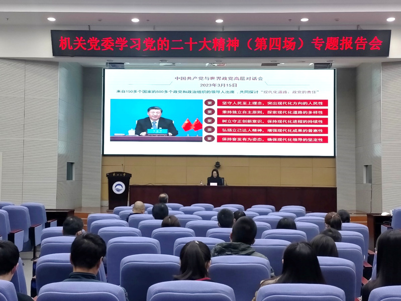 3月21日下午,机关党委学习贯彻党的二十大精神第四场专题报告会在主楼822室召开,学校党的二十大精神宣讲团成员曾薇作题为“以中国式现代化全面推进中华民族伟大复兴”的专题报告。校机关党员和干部代表近100人参加学习。机关党委书记初青松主持报告会。