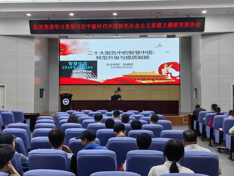 6月13日下午,机关党委在主楼822会议室举办学习贯彻习近平新时代中国特色社会主义思想主题教育(第二场)专题报告会。学校主题教育宣讲团成员、文法学院副教授陈德权作《二十大报告中的智慧中国:转型升级与提质赋能》报告。校机关党员和干部110余人参加学习。