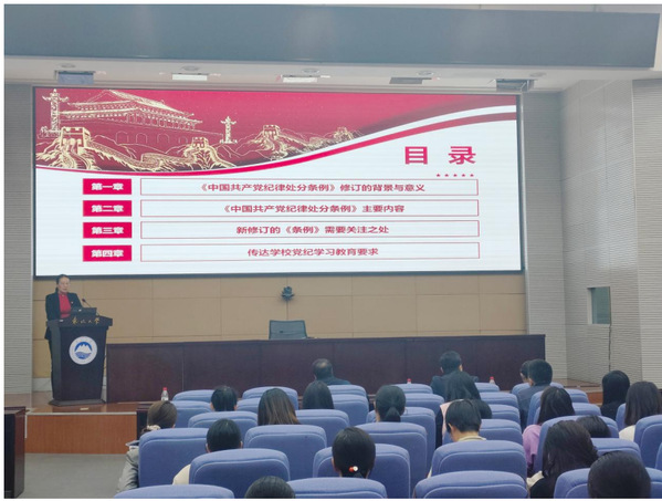 曲桂贤向全体党员传达了学校关于党纪学习教育相关要求,并为全体党员讲授党课,简要介绍了《条例》修订的背景、意义和主要修订内容,分享了学习新修订的《中国共产党纪律处分条例》(以下简称《条例》)的体会。她要求全体党员深刻认识党纪学习教育的重要意义:开展党纪学习教育,是推进全面从严治党向纵深发展的重要举措,是实现党的自我革命和保持纯洁性的有效途径,更是推动事业发展和强化责任担当的有力保障。