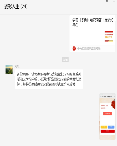 第二阶段为学习问答阶段。支部积极组织参与中央纪委国家监委网站关于学习《条例》学习问答活动,促进对重点内容的掌握和理解,打好“学而时习之”知纪拳。使党员搞清楚党的纪律规矩是什么,弄明白能干什么、不能干什么,知道是非界限、清楚自律标准。同时,促使非党员同事也要严格按照党员标准约束言行。